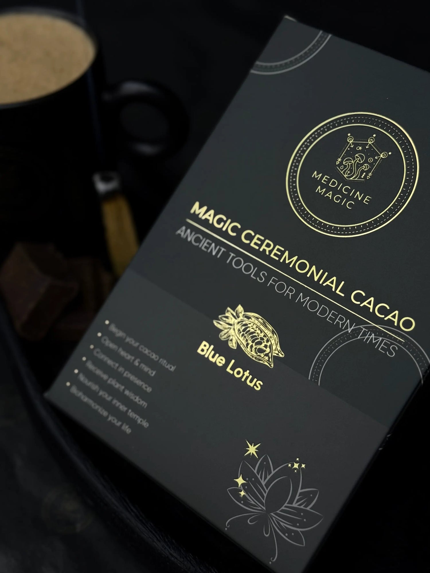 Ceremonial Cacao infused with Nymphaea Caerulea extract.
